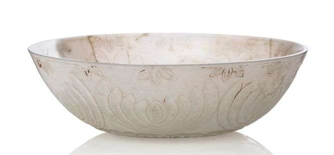 Petite coupe en jade translucide dans le goût des Moghols, à décor de fleurs de lotus épanouies. (Fêles)