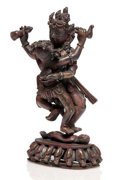 Sujet en alliage de cuivre de patine brun-rouge représentant la Chakrasamvara debout, tenant le kapala et la gantha, en yabyum avec sa shakti qui tient kapala et karttrika. Les deux divinités dansent sur un pied posé sur un corps humain allongé sur le socle lotiforme. Avec une inscription au revers du socle.