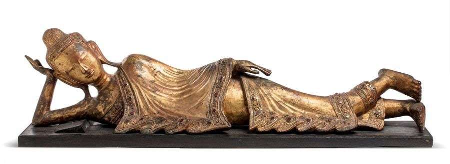 Grand bouddha allongé en parinirvana, en bois sculpté et doré, vêtu d'une robe incrustée de verroteries reprenant la forme de motifs floraux stylisés.