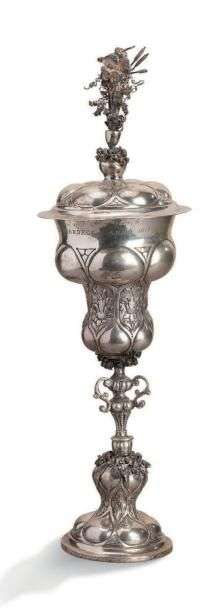 COUPE COUVERTE en argent dans le style du XVIIe siècle, à décor de cupules, le fût balustre à motifs ajourés d'enroulements, le couvercle surmonté de la prise en bouquet. Gravée sous le col, JOACHIM GOTTFRIED HARDECK ANNO 1617.