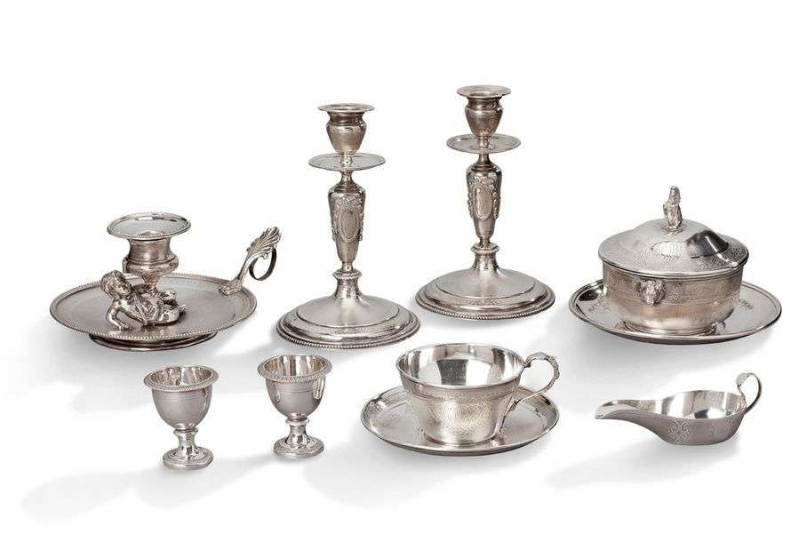 Une paire de bougeoirs Un chandelier de bibliothèque Une tasse Un sucrier Deux coquetiers Deux coupelles Une verseuse