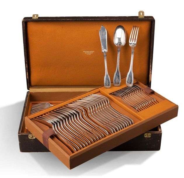 MÉNAGÈRE en argent, modèle à godrons comprenant: Douze grands couverts Douze petits couverts Douze petites cuillères Douze couverts à poisson