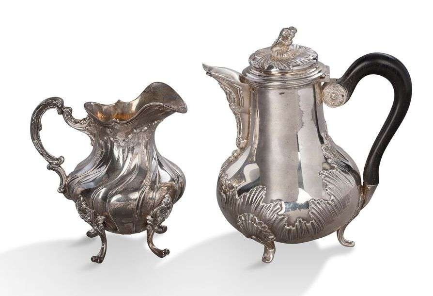 THÉIÈRE à motifs rocaille, poinçon minerve, maitre orfèvre Henri Soufflot. Un pot à lait à motifs rocaille, Poinçon minerve