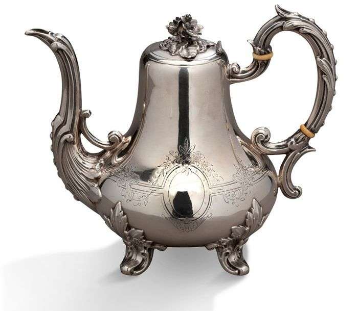 THÉIÈRE en argent ciselé à décor rocaille. Le manche à bagues en ivoire.