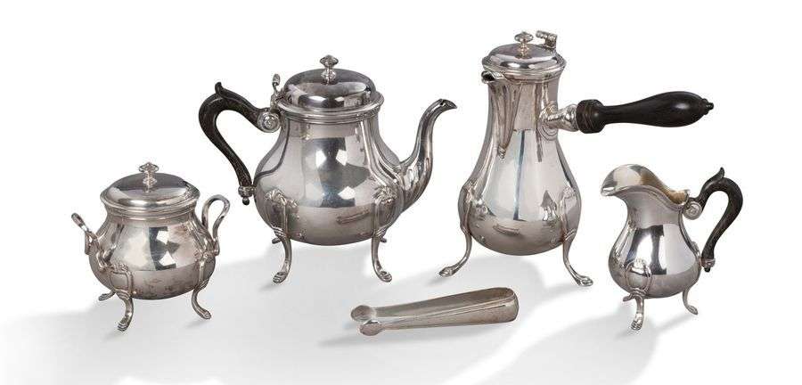 SERVICE À THÉ en argent poinçon minerve, manche en ébène, comprenant: Une théière, une chocolatière (en argent XVIIIe, Paris), un pot à lait, un pot à sucre