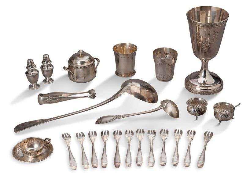 ENSEMBLE en argent dépareillé comprenant: Une louche, modèle à filet, poinçon vieillard Deux saupoudreuses, poinçon minerve Deux timbales dont une Puiforcat, poinçons minerve Douze fourchettes à huître, poinçon minerve Deux salerons et une cuillère à décor de godrons, poinçon minerve Une tasse et sous-tasse, poinçon minerve Un calice, poinçon minerve Un sucrier, poinçon minerve Une petite louche, poinçon minerve