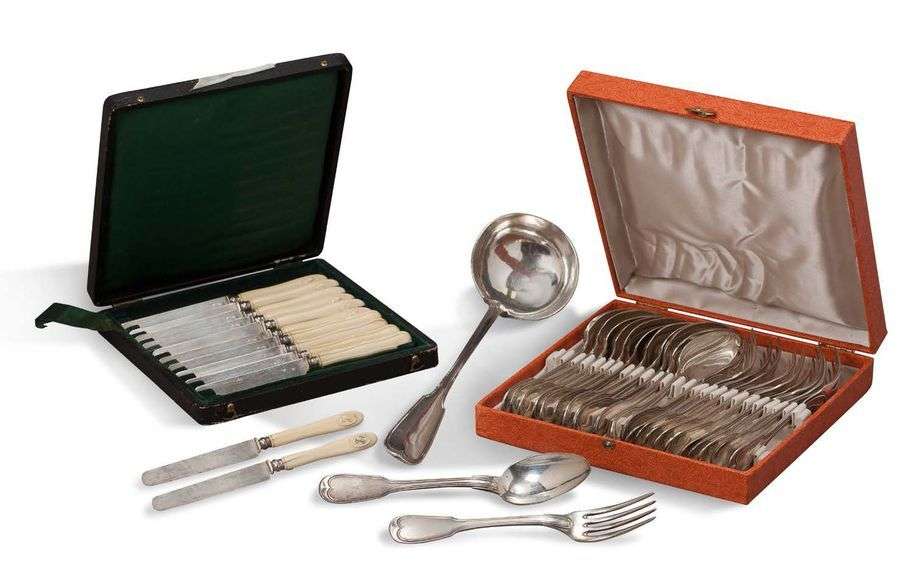 ENSEMBLE en argent, modèle à filets (dépareillé): Douze couverts Douze couteaux à fruit, manche en ivoire Une louche