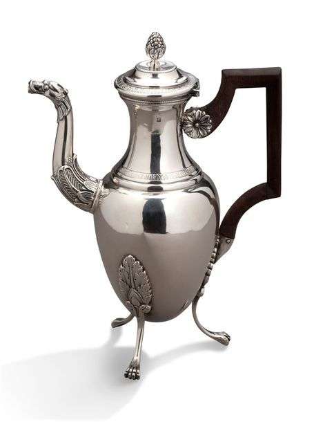CAFETIÈRE en argent à décor en applique de feuilles d'acanthe. Elle repose sur trois pieds griffes, prise en forme de graine. Manche en ébène.