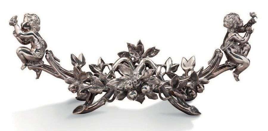 Jardinière oblongue en métal argenté posant sur quatre pieds formés de deux branches surmontées de feuillages et de fruits. Les anses formées de putti et volatiles.