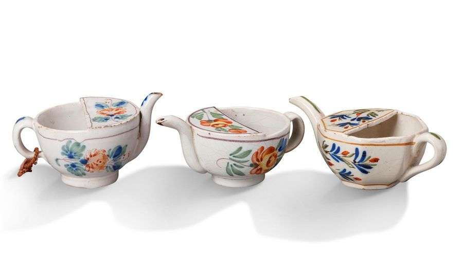 AUVILLAR TROIS BIBERONS DE MALADE en faience décoré en bleu et rouge de fl