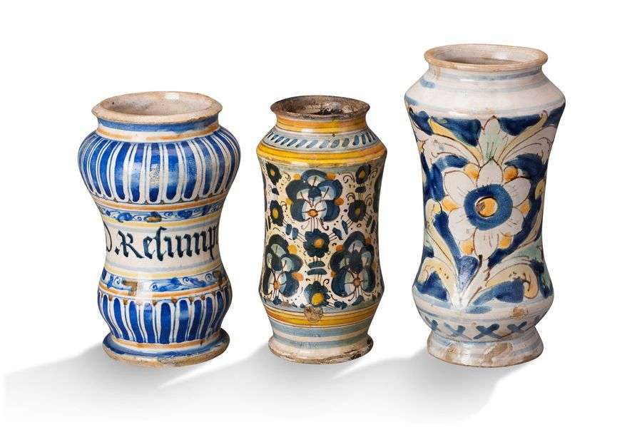 TROIS ALBARELLI en faïence dont deux de forme cylindrique cintrées décorés en polychromie de fleurs stylisées, le troisième à double bulbe en bleu à godrons peints encadrant une inscription pharmaceutique.
