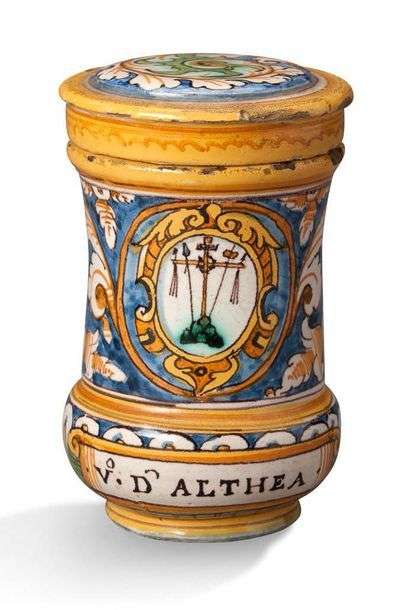 RARE ALBARELLO en faïence de forme cintrée et son couvercle à décor polychrome de feuilles d'acanthes traitées en enroulement encadrant dans un large cartouche rocaille sur fond de cuirs les attributs de la passion surmontant une inscription pharmaceutique.