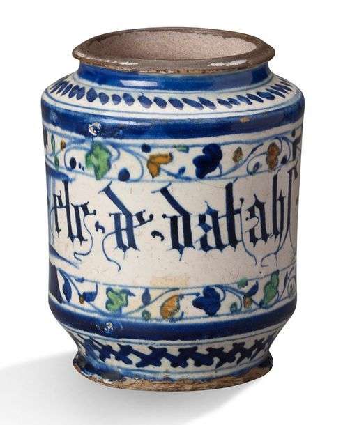 FAENZA, ALBARELLO CYLINDRIQUE à épaulement en faïence à décor polychrome de fleurs et de rinceaux encadrant une inscription pharmaceutique en lettres gothiques dans un phylactère.