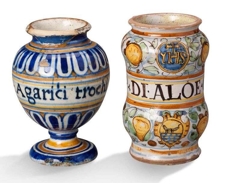 UN PILULIER CIRCULAIRE SUR PIÉDOUCHE en faience décoré en polychromie de godrons encadrant une inscription pharmaceutique (LYON fin XVIe, début XVIIe siècle) et un albarello cylindrique en faience à décor de feuillages et fleurs encadrant une inscription pharmaceutique et daté «daté 1610...»