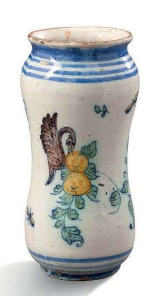 POT À PHARMACIE en faïence de forme cylindrique cintrée à décor polychrome de volatiles et de fleurs.