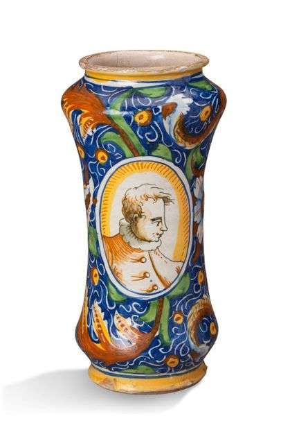 TRÈS BEL ALBARELLO en faïence de forme cylindrique cintrée à décor polychrome de feuillages et de fruits sur fond bleu encadrant deux médaillons de chaque côté, l'un à décor d'un jeune homme en buste portant une fraise l'autre à décor d'un homme en buste avec chapeau. Attribué à Maestro Giorgio.