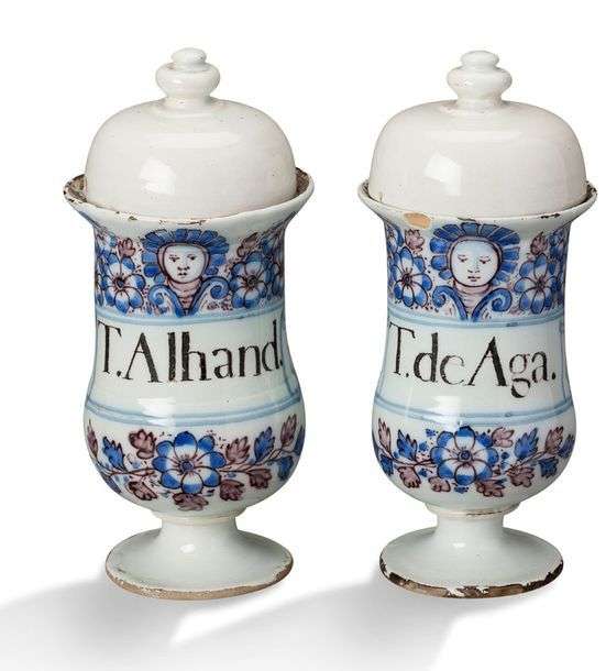 DEUX «POTS CANON» COUVERTS CYLINDRIQUES sur piédouche à fond blanc décorés en bleu et manganèse d'inscriptions pharmaceutiques en adorées de feuillages et surmontées de têtes de personnages en bleu et manganèse.