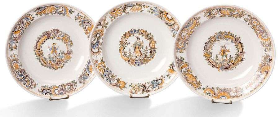 SUITE DE TROIS ASSIETTES CIRCULAIRES en faïence à décors polychromes de personnages au centre dans des médaillons formés de cartouches fleuris, l'aile richement ornée de rinceaux, coquilles et fleurs.