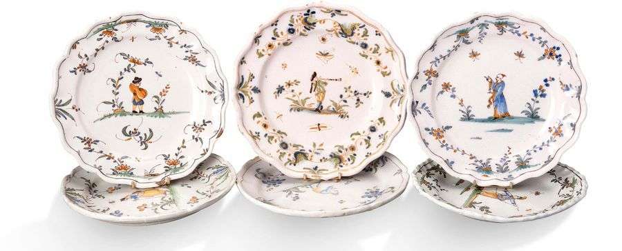 SIX ASSIETTES en faïence à bordure contournée décorées en polychromie de personnages encadrés de fleurs et de papillons.
