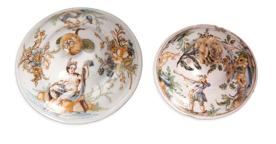 DEUX BEAUX COUVERCLES D'ÉCUELLES À BOUILLON en faïence de forme circulaire à décor polychrome de Bacchus et de lièvre. Les prises en forme de fleurs ou de fruit.
