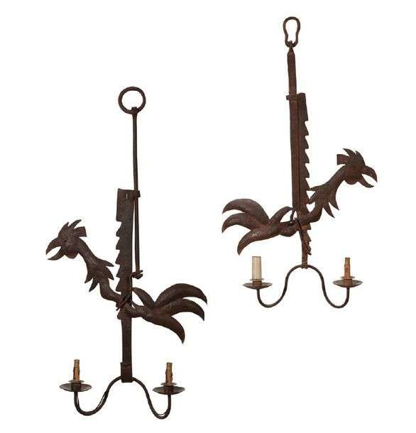 DEUX CRÉMAILLÈRES en fer forgé transformée en appliques à deux lumières ornées d'un motif de coq.