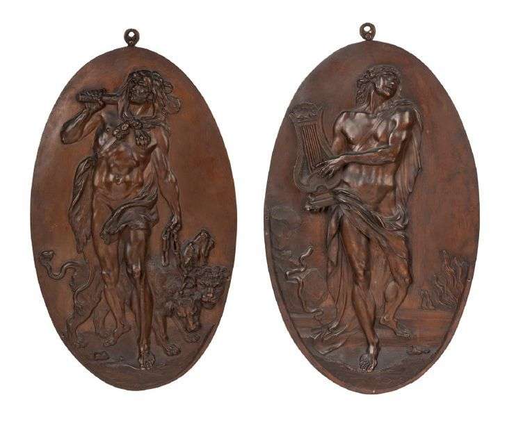 PAIRE DE PLAQUES en cuivre de forme ovale, repésentant Hercule et Apollon.