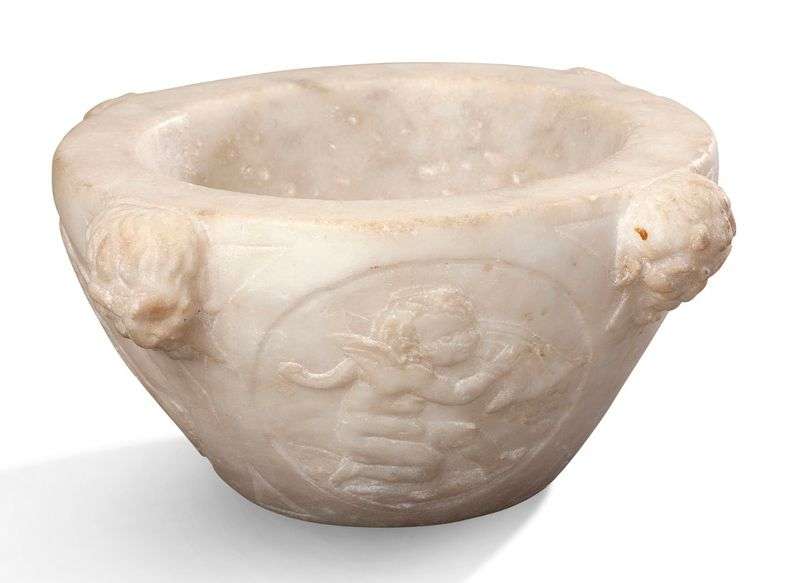 MORTIER en marbre blanc à décor de médaillons et de masques sculptés en relief.