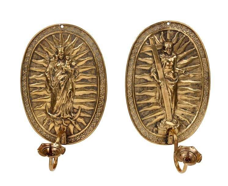 PAIRE DE BRAS DE LUMIÈRE DE FORME OVALE en laiton repoussé représentant le christ et une vierge à l'enfant.