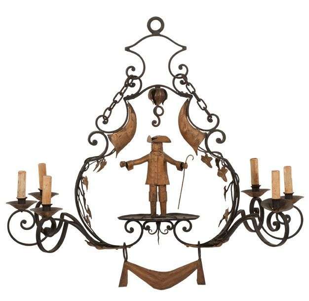 LUSTRE en fer forgé peint et doré à six lumières, inspiré des enseignes du