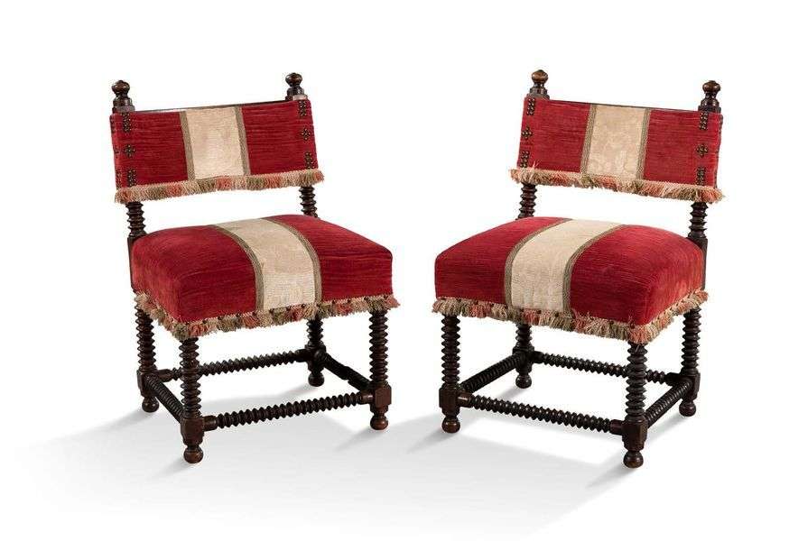 PAIRE DE SIÈGES D'ENFANT en bois torsadé. Garniture de velour rouge