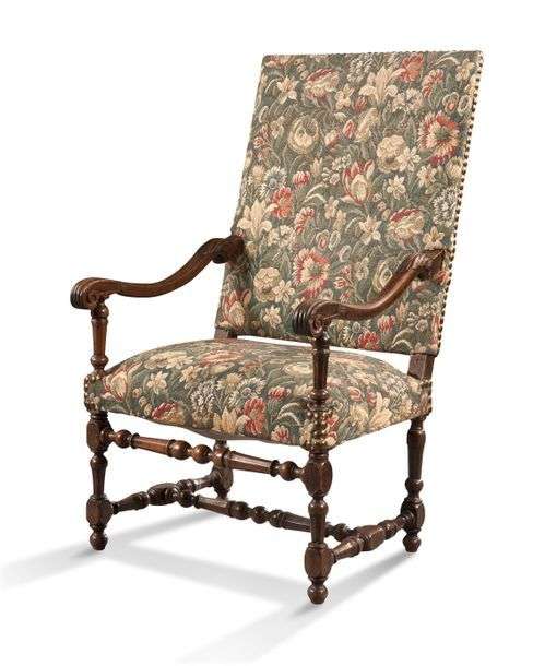 IMPORTANT FAUTEUIL À HAUT DOSSIER en bois naturel mouluré sculpté. Les bras à enroulements en crosse sont ornés d'acanthes et reposent sur des supports balustre. Piètement en bois tourné réuni par une barre d'entretoise formant un H.