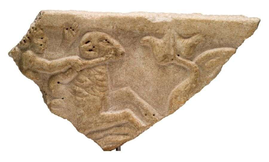 FRAGMENT DE SARCOPHAGE (?) représentant un Eros tenant les rennes d'un caprin (sans doute un capricorne). Il s'agissait sans doute d'une scène de cortège marin, puisqu'une queue d'animal marin est encore visible à droite de la scène.