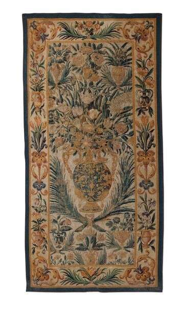TAPISSERIE à bordures d'urnes fleuries et à décor au centre d'un vase fleu