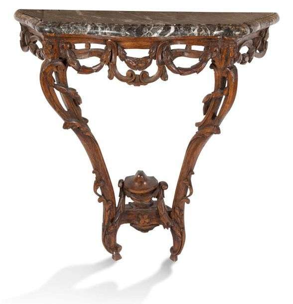 CONSOLE en bois naturel mouluré à ceinture ajourée à décor de volutes et guirlandes. Piètement sinueux réuni par une urne à l'antique. Plateau de marbre veiné noir et blanc