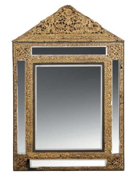 MIROIR À PARECLOSES en bois noirci et feuilles de laiton découpées et ciselées de frises de fleurettes et feuillages. Il est surmonté d'un fronton triangulaire orné de fleurs dans un réseau de volutes.