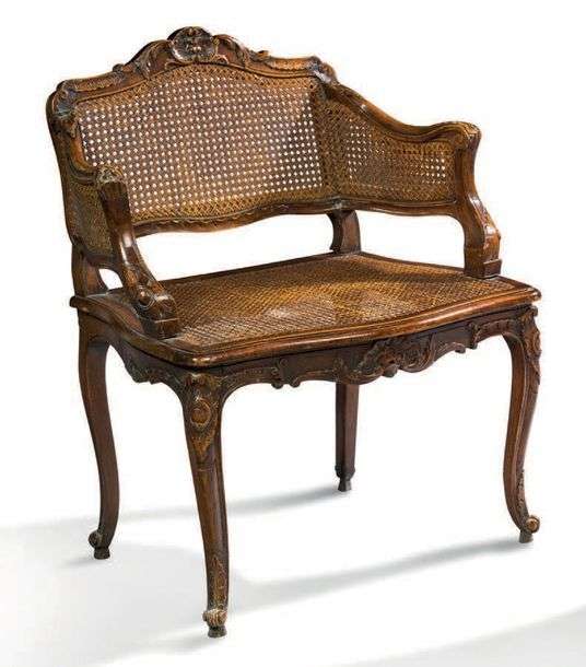 PAIRE DE FAUTEUILS cannés à dossier bas en bois naturel mouluré sculpté à motifs rocaille. Ceinture chantournée et pieds cambrés.