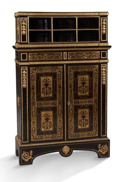MEUBLE EN MARQUETERIE BOULLE en placage d'ébène et laiton à décor compartimenté de motifs à la bérain. Il ouvre en partie haute par six casiers évidés, deux tiroirs en ceinture et deux portes en partie basse. Riche ornementation de bronze ciselé et doré tel que chutes de laurier et frises de poste.