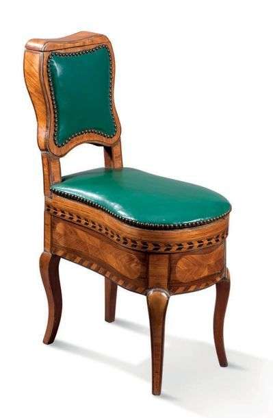 CHAISE D'AISANCE en marqueterie de bois de rose et amarante. Elle découvre un bassin en faïence bleu blanc (restaurations) de Rouen. Estampillée D. Gentil et JME