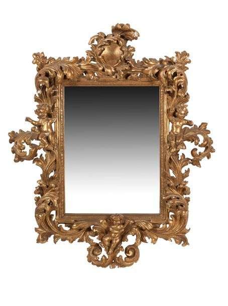MIROIR rectangulaire en bois richement sculpté et doré à décor rocaille de larges feuilles d'acanthe et de puttis