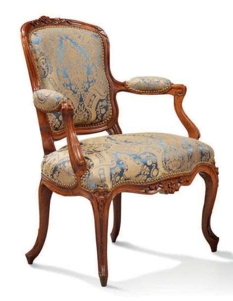 PAIRE DE FAUTEUILS en bois naturel mouluré et sculpté de nervures, fleurettes et feuillages. Ceinture chantournée, bras et pieds cambrés.