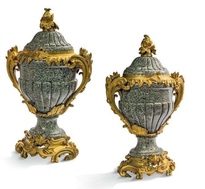 PAIRE DE VASES COUVERTS en granit vert et bronze ciselé et doré.