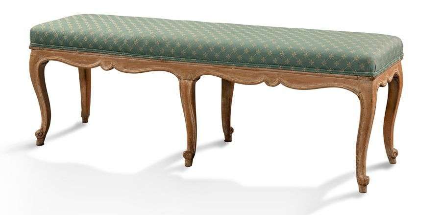 PETITE BANQUETTE en bois naturel anciennement laqué. La ceinture chantournée repose sur six pieds à enroulements.