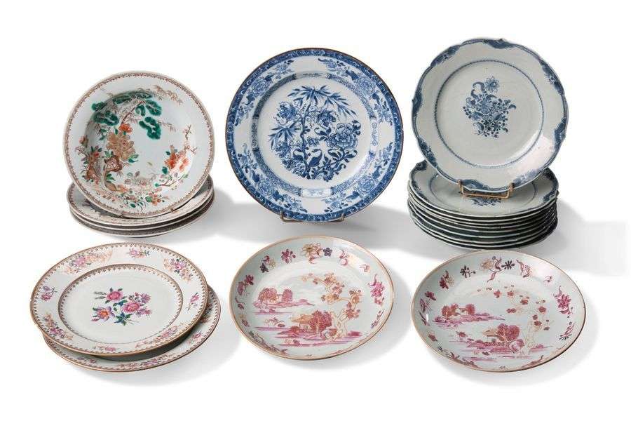 ENSEMBLE DE DIX NEUF ASSIETTES en porcelaine polychrome et bleu à fond blanc à décor de fleurs, branchages et paysages.