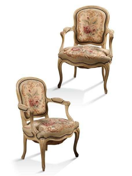 PAIRE DE FAUTEUILS CABRIOLET en bois mouluré et laqué crème. Bras et pieds