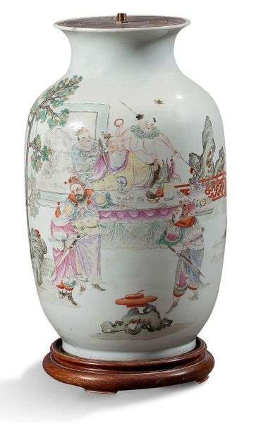 VASE MONTÉ EN LAMPE en porcelaine de la famille rose à décor de personnages animés.