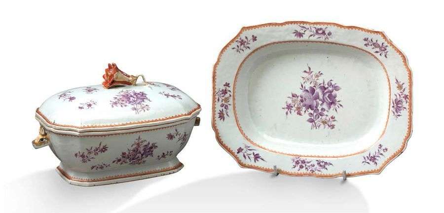 COMPAGNIE DES INDES SOUPIÈRE ET SON PRÉSENTOIR en porcelaine à décor de co