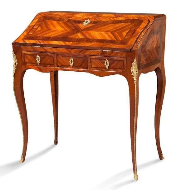 BUREAU DE PENTE en placage de bois de rose et bois de violette marqueté en feuilles. L'abattant découvre deux casiers et trois tiroirs. La ceinture mouvementée ouvre par deux tiroirs. Il repose sur quatre pieds cambrés. Ornementation de bronze ciselé et doré.