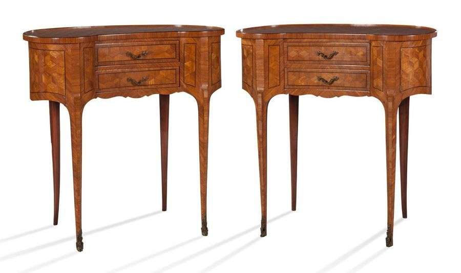 PAIRE DE PETITES TABLES ROGNON en placage de bois marqueté en cube et filets de bois noirci. Elle ouvre par deux tiroirs en façade et reposent sur quatre pieds cambrés.