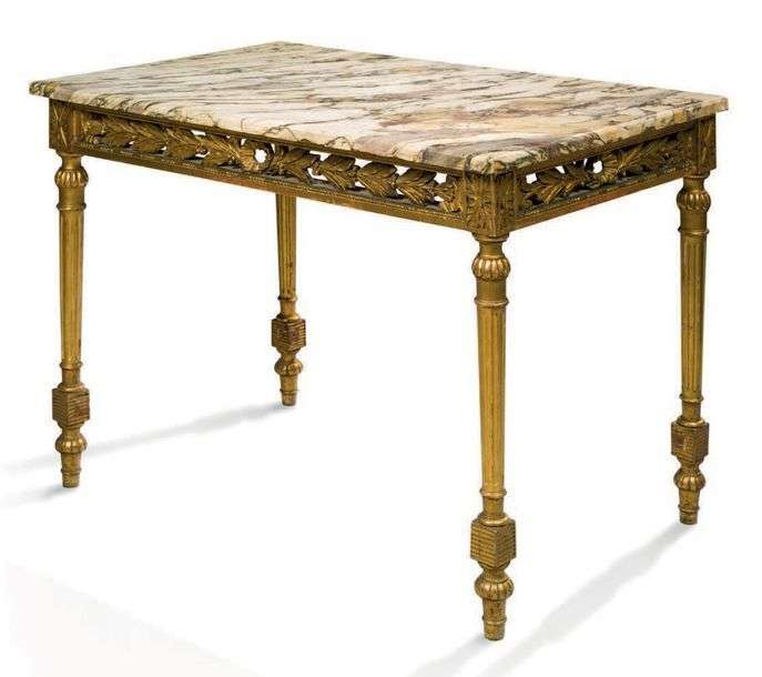 TABLE DE MILIEU de forme rectangulaire en bois doré et sculpté à ceinture ajourée. Elle repose sur des pieds fuselés et cannelés. Plateau de marbre blanc veiné rose.