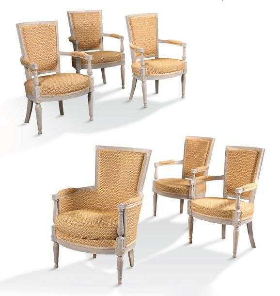 CINQ FAUTEUILS, UNE BERGÈRE ET UN REPOSE PIED en bois relaqué gris. Les su